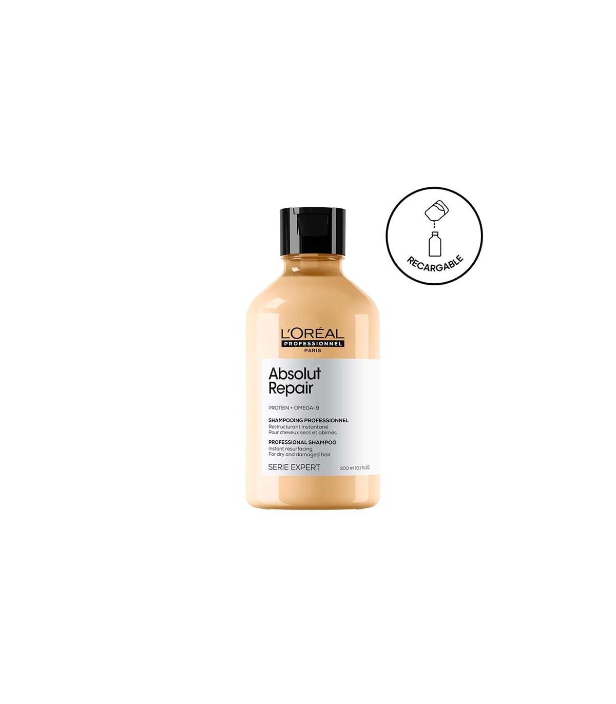 Champú reparador-fortalecedor Absolut Repair, serie Expert de Loreal, 300 ml. Limpia, fortalece y repara el cabello.